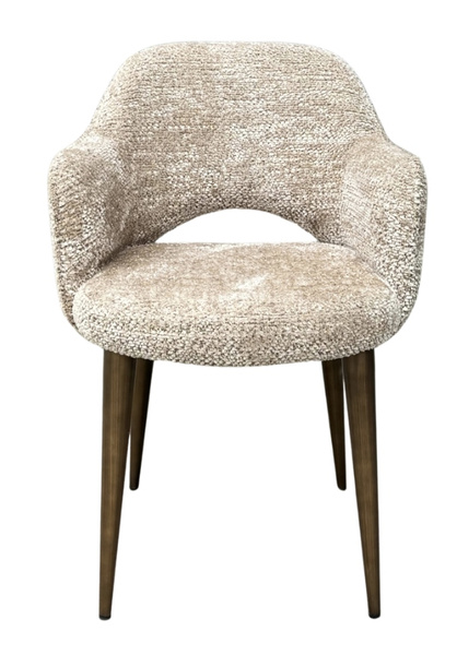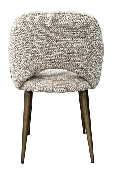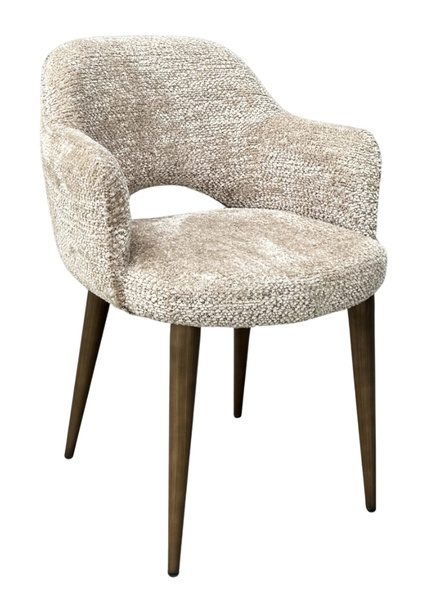Opływowy kształt i przytulna, miękka w dotyku tapicerka w naturalnym odcieniu beżu tworzą przyjazną i stylową atmosferę przy stole.
