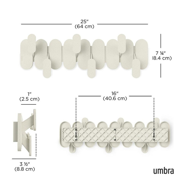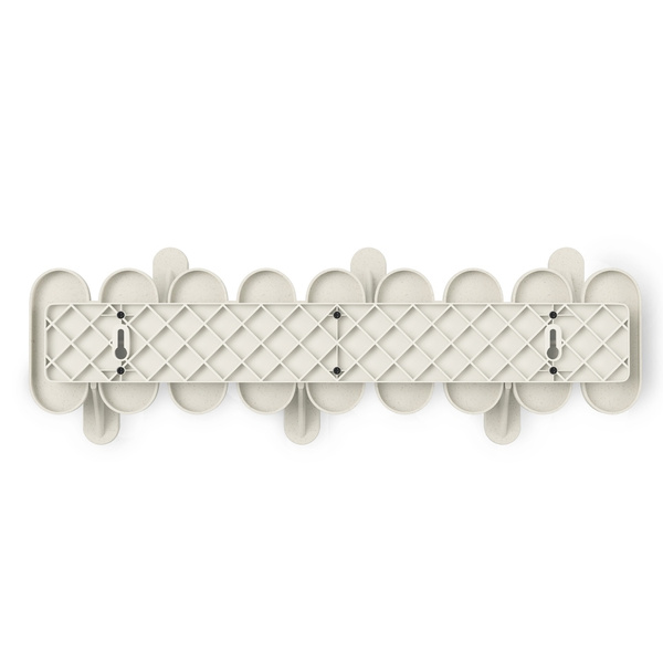 UMBRA wieszak na ubrania TEMPO 6 beżowy. Połączenie funkcjonalności i współczesnego wzornictwa. Sześć naprzemiennie rozmieszczonych haczyków zapewnia maksymalną przestrzeń do zawieszania ubrań, toreb czy ręczników. Wykonany z lekkiego i trwałego tworzywa sztucznego pochodzącego z recyklingu z dodatkiem włókna drzewnego, oferuje nie tylko solidność, ale także subtelną, naturalną fakturę. Nowoczesna, graficzna forma wieszaka idealnie wpisuje się w różne przestrzenie - od przedpokoju, przez sypialnię, aż po łazienkę. Model dostępny jest w kolorze czarnym oraz beżowym, co pozwala dopasować go do różnych aranżacji wnętrz. Wieszak nie tylko świetnie wygląda, ale też jest praktycznym rozwiązaniem do codziennego użytku. Wymiary: wys. 16 cm / szer. 47 cm / gł. 6 cm Waga netto: 0,5 kg.