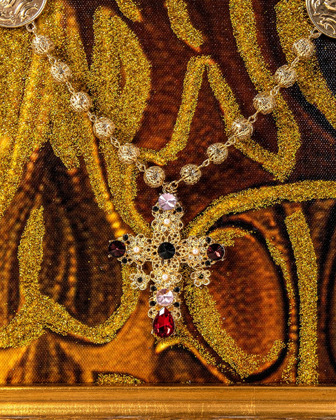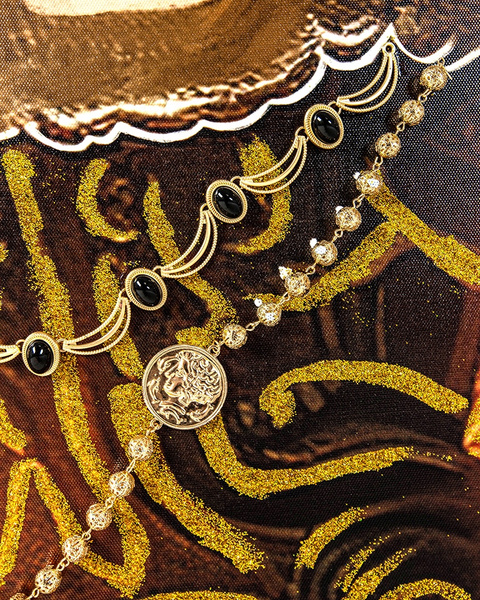 Obroża wzbogacona jest naszyjnikiem oraz prawdziwym dzwoneczkiem.