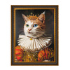 Ubrany w ekskluzywne, królewskie szaty, zdobione bogatymi detalami oraz majestatyczną koronę na głowie, kot emanuje elegancją i pewnością siebie.