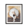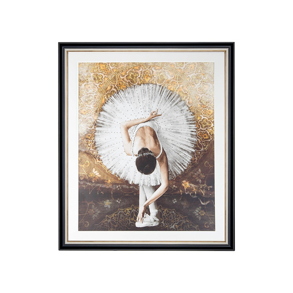 Obraz BALLERINA 3 100x120 cm. Dostojny obraz przedstawiający piękną, uroczą, kłaniającą się baletnicę. To wyjątkowe dzieło sztuki, które zachwyca swoją elegancją i subtelnością. Wykonany w formie nadruku, obraz oprawiono w szykowną, grubą czarno-złotą ramę, która dodaje mu wyrafinowanego charakteru. Tańcząca kobieca postać emanuje gracją, wnosząc do wnętrza nutę dostojnej elegancji i klasy. Sukienka oraz dekoracja na głowie wysadzone są cyrkoniami, które dodają blasku. To doskonały wybór dla miłośników sztuki, stanowiący hołd dla piękna i delikatności tańca. Obraz ten z pewnością przyciągnie uwagę gości, wzbudzając zachwyt i podziw. Wymiary: wys. 120 cm / szer. 100 cm / gł. 3 cm.