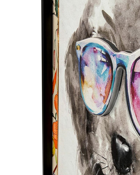 Obraz COFFEE DOG 100x100 cm. Nowoczesny obraz przedstawiający psa w krzywym zwierciadle: w kolorowych okularach przeciwsłonecznych i pijącego kawę. Coffee Dog to pełne humoru i stylu dzieło, które wprowadza nutę pozytywnej energii do wnętrza. Modernistyczny charakter oraz żywe barwy sprawiają, że idealnie nada się do jadalni, salonu, jako element przyciągający wzrok i wywołujący uśmiech na twarzy. Wydruk na płótnie, oprawiony w kwiatową ramę z wyszczególnionymi, kolorowymi okularami z akrylu, łączy w sobie nowoczesny design z oryginalną stylistyką. To wyjątkowy dodatek, który doda charakteru każdemu wnętrzu. Wymiary: wys. 100 cm / szer. 100 cm / gł. 3 cm.