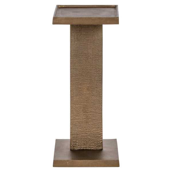 RICHMOND stolik FOLEY antyczny mosiądz. Połączenie surowego minimalizmu z eleganckim wykończeniem w stylu antycznym. Wykonany z aluminium, zachwyca solidną formą oraz charakterystyczną, ręcznie wykończoną powierzchnią o teksturowanym detalu. Smukła, geometryczna sylwetka i wyrazista linia podstawy sprawiają, że idealnie odnajdzie się zarówno w nowoczesnych, jak i eklektycznych wnętrzach. Mosiężne wykończenie dodaje całości ciepłego blasku i klasycznego charakteru. Stolik doskonale sprawdzi się jako pomocnik przy sofie lub jako elegancki postument do wyeksponowania dekoracji. To mebel, który łączy prostotę formy z artystycznym rzemiosłem. Wymiary: wys. 43 cm / szer. 25 cm / gł. 25 cm Waga netto: 5,1 kg.
