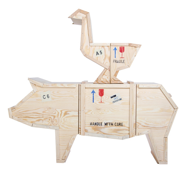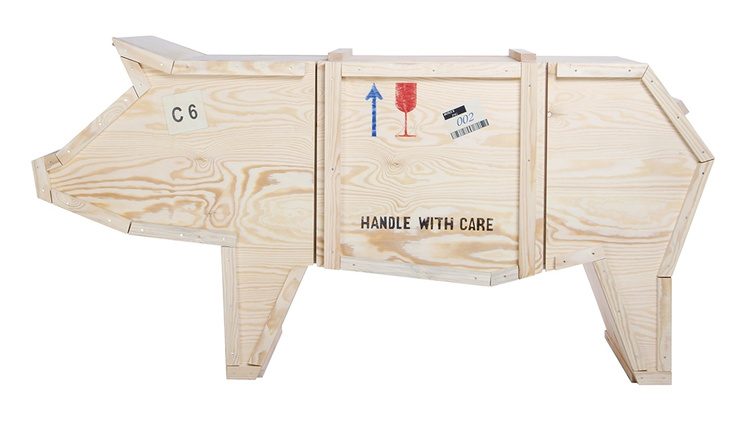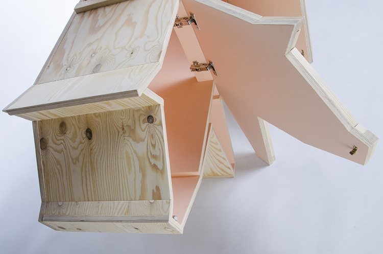Szafka w kształcie świni wykonana w całości ze sklejki drewnianej.