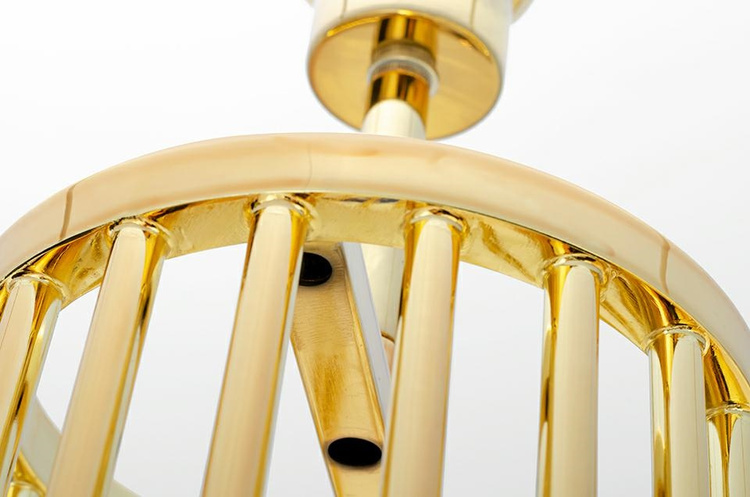 Lampa wykonana ze stali węglowej w kolorze złotym, błyszczącym.