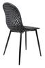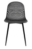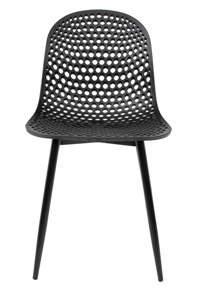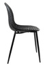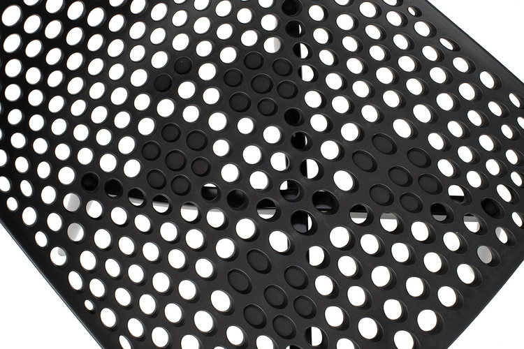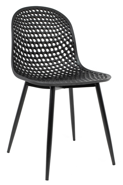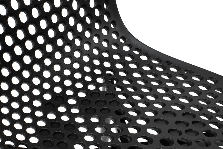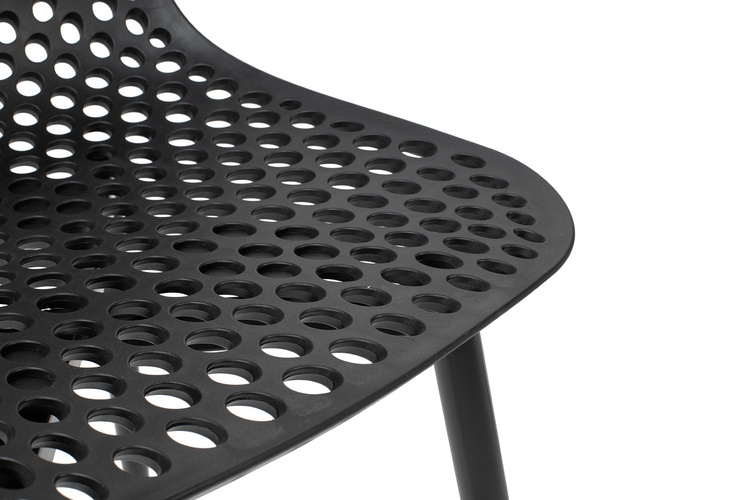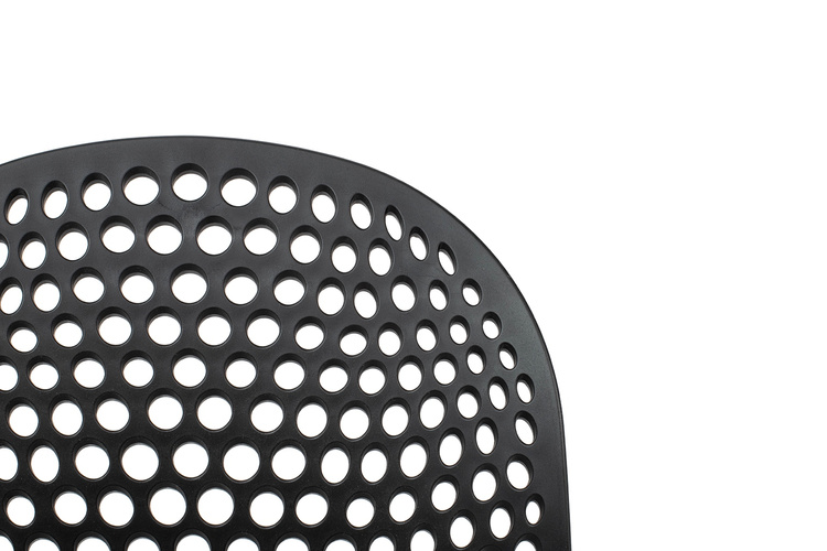 Wyprofilowane siedzisko z ażurowym motywem ozdobnym zostało wykonane z polipropylenu w kolorze czarnym matowym.