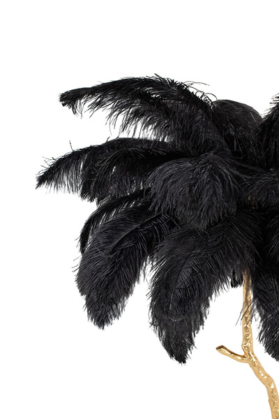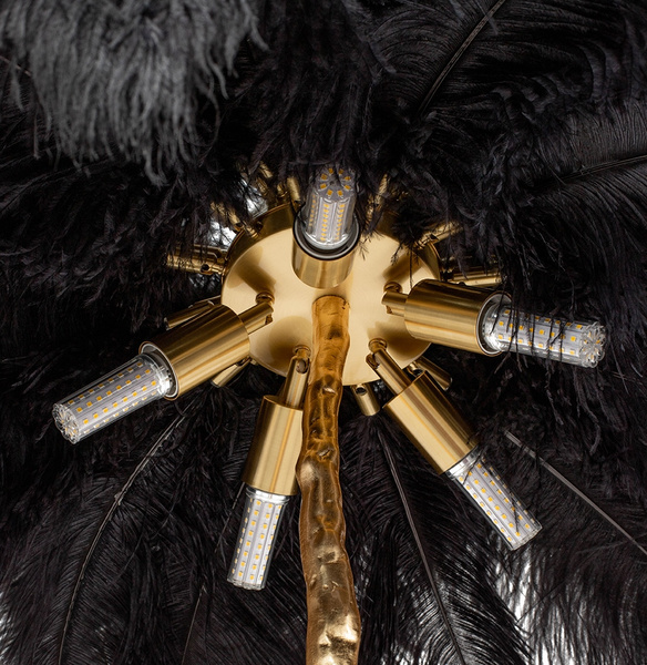 Klosz lampy tworzy 45 sztuk gęsto ułożonych, naturalnych strusich piór o długości 55-60 cm. Całość kompozycji w połączeniu