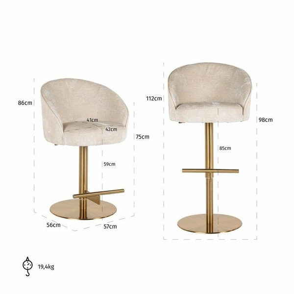 RICHMOND krzesło barowe ZABI regulowane. Zabi to produkt niosący nowoczesny, minimalistyczny styl. To praktyczne krzesło barowe, które podkreśli domową atmosferę w Twoim domu. Wykonany jest z aksamitnej tkaniny szenilowej w jasnym beżowym odcieniu. Szenil to tkanina miękka w dotyku, charakteryzująca się jedwabistym połyskiem oraz co najważniejsze odporna na zabrudzenia. Podstawę zdobi elegancka złota stal nierdzewna. Dodatkowym atutem jest możliwość regulacji wysokości siedziska oraz możliwość obrotu o 360°. Dostępna również wersja w innej tkaninie. Wymiary: wys. 110 cm / szer. 58 cm / gł. 55 cm Waga netto: 19,4 kg.