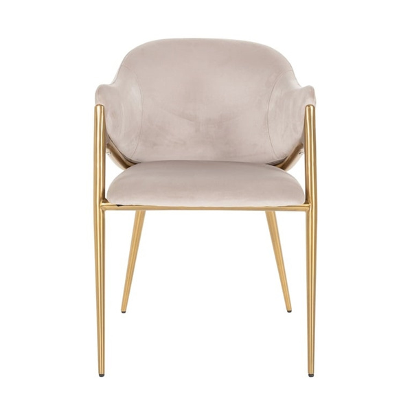 RICHMOND krzesło GWEN beżowe. Stylowe krzesło Gwen marki Richmond Interiors charakteryzuje się luksusową i zgrabną formą. Siedzisko zostało tapicerowane przyjemnym w dotyku welurem w beżowym odcieniu. Złote akcenty ze stali nierdzewnej znakomicie współgrają z całością. Co więcej, użyte materiały są ogniotrwałe, co gwarantuje dodatkowe bezpieczeństwo dla Twojego domu. Krzesło Gwen to przede wszystkim komfort i ponadczasowa elegancja w nowoczesnym wydaniu. Dostępna także czarna wersja. Wymiary: wys. 79,5 cm / szer. 54 cm / gł. 57,5 cm Waga netto: 8 kg.