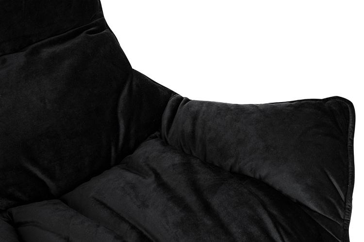 Dużą miękką poduchę obszyto aksamitną welurową tkaniną w kolorze czarnym, dzięki czemu każda spędzona chwila jest przyjemna i pełna relaksu.