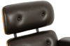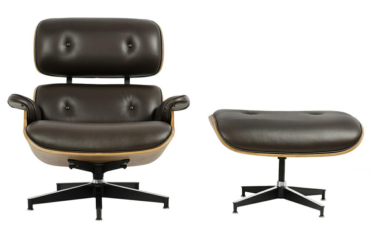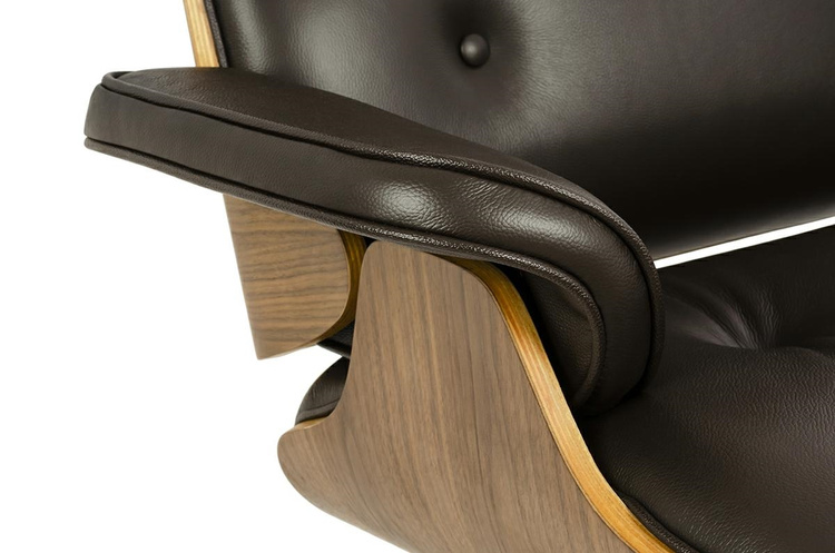 Cały fotel wraz z podnóżkiem tapicerowane są naturalną włoską skórą w kolorze brązowym. Zarówno korpus fotela jak i podnóżka został wykonany