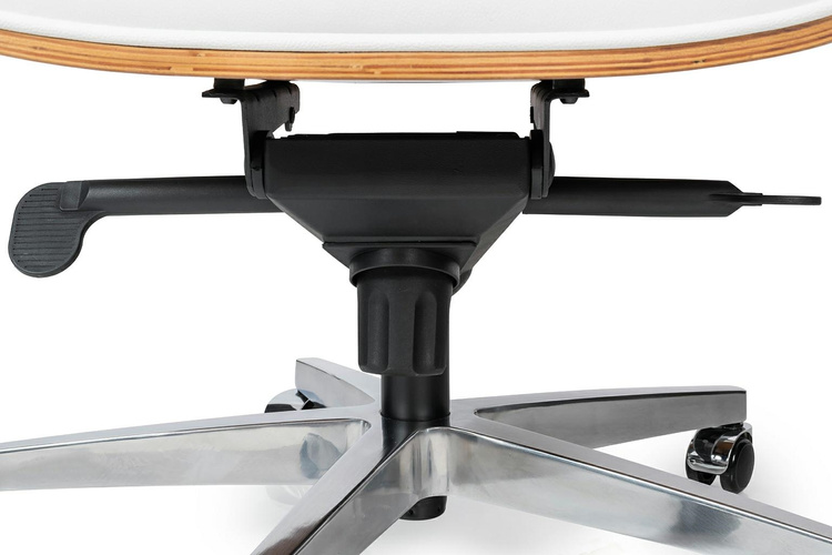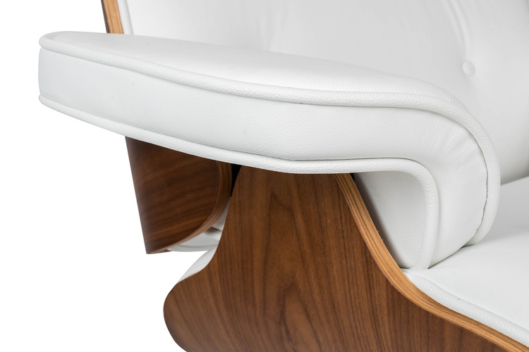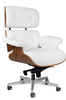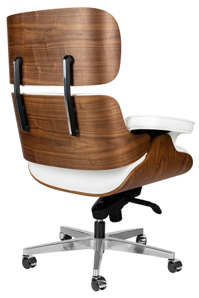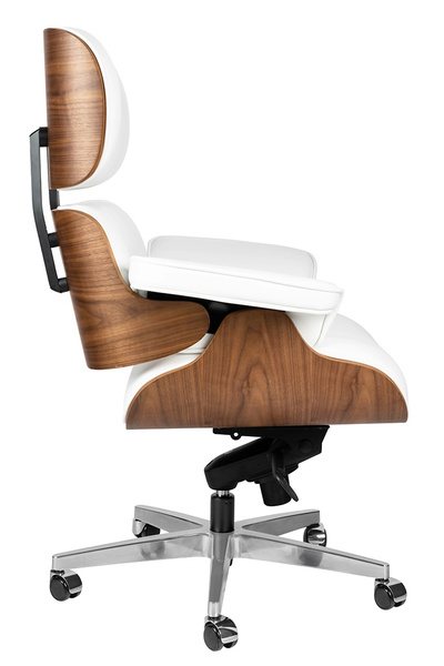 Fotel biurowy Lounge Gubernator biały z orzechowym drewnem.