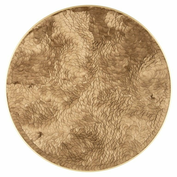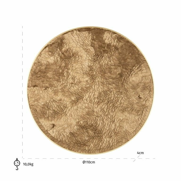 Okrągłe dzieło sztuki wykonano z aluminium połączonego z drewnem, skórą i wykończono w złotej kolorystyce.