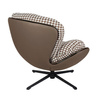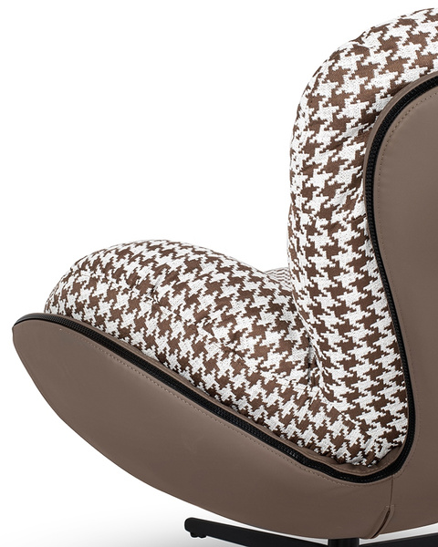 Fotel obrotowy HIPPO brązowa pepitka. Przytulny, wielofunkcyjny fotel obrotowy, który wniesie wyjątkowy klimat i charakter do Twojego wnętrza. Korpus wykonano ze skóry PU w brązowej kolorystyce. Dużą, miękką poduchę obszyto tkaniną o wzorze pepitki, która symbolizuje elegancję oraz wygodę na najwyższym poziomie. Czarna podstawa ze stali posiada wbudowany mechanizm obrotowy, który sprawdzi się podczas codziennego użytku. Fotel Hippo polecamy jako stylowe miejsce do wypoczynku w salonie czy biurze. Wymiary: wys. 90 cm / szer. 97 cm / gł. 95 cm Wysokość do krawędzi siedziska: 52 cm Siedzisko: szer. 42 cm / gł. 50 cm Oparcie: wys. 55 cm / szer. 60 cm Podstawa: 57 x 57 cm.