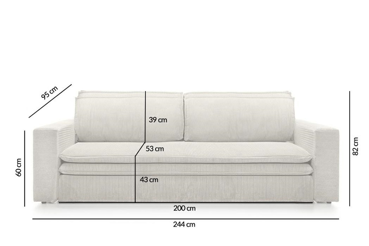 Sofa SENSE z funkcją spania. Nowoczesny design połączono z funkcjonalnością. Sofa Sense zapewnia najwyższą jakość oraz wykonanie dzięki Polskiej produkcji. Miękkie, wygodne siedzisko wykonano ze sprężyny falistej oraz pianki PUR. Prezentowana na zdjęciu tkanina to przyjemna w dotyku tkanina sztruksowa w jasnobeżowym wykończeniu z grupy tkanin Poso. Jest to materiał odporny na ścieranie oraz działanie światła. Dostępne również tkaniny łatwoczyszczące oraz hydrofobowe. Dodatkowy komfort zapewniają poduszki oraz dwuwarstwowy materiał, który doskonale sprawdzi się po rozłożeniu mebla do nocnego wypoczynku. Wbudowany pojemnik na pościel pozwoli na schowanie pościeli oraz poduszek podczas dnia. Możliwość personalizacji sprawia, że możesz stworzyć wymarzoną sofę o idealnej kolorystyce i tkaninie, pasującej do Twojego wnętrza. Dostępna również wersja Slim z węższymi podłokietnikami. Wymiary: wys. 82 cm / szer. 244 cm / gł. 95 cm Wysokość do krawędzi siedziska: 43 cm
