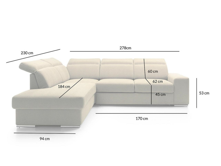 Narożnik DAMBO z funkcją spania. Nowoczesny styl wzbogacono niezwykłą funkcjonalnością. Sofa narożna Dambo gwarantuje najwyższą jakość oraz wykonanie dzięki Polskiej produkcji. Wygodne siedzisko i oparcie wykonano ze sprężyny falistej oraz pianki PUR. Możliwość wyboru tkaniny sprawia, że możesz w pełni dopasować sofę do swoich potrzeb. Dostępne również tkaniny łatwoczyszczące oraz hydrofobowe. Eleganckiego charakteru dodaje podstawa wykończona w srebrnym kolorze. Możliwość rozłożenia mebla do nocnego wypoczynku oraz regulacja zagłówków sprawia, że będzie to idealny mebel dla całej rodziny, jak i odwiedzających gości. Dodatkowym atutem jest wbudowany pojemnik, który pozwoli na codzienne utrzymanie porządku oraz przechowanie pościeli. Wymiary: wys. 105 cm / szer. 278 cm / gł. 94 cm Wysokość do krawędzi siedziska: 45 cm.