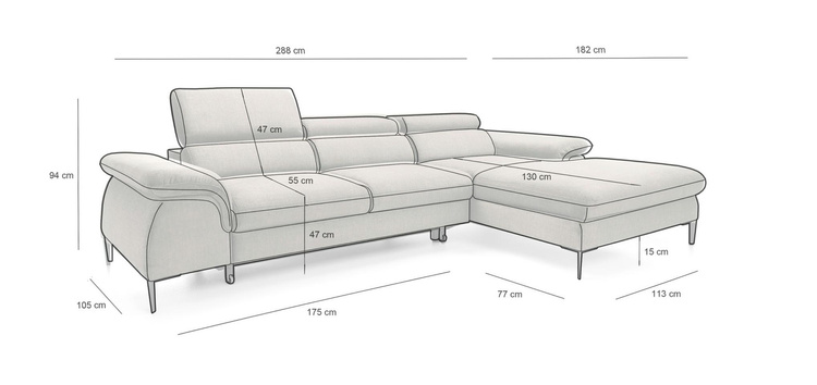 Wymiary: wys. 94 cm / szer. 288 cm / gł. 182 cm