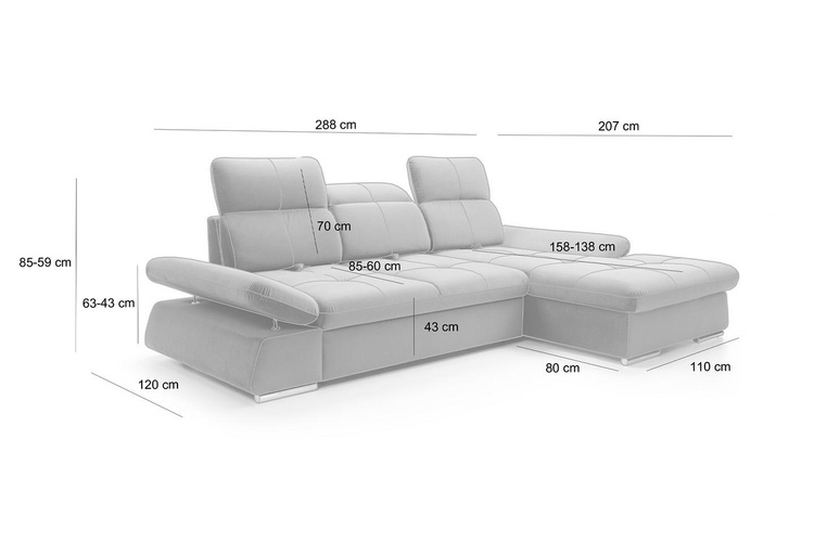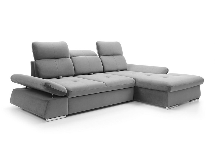 Wielofunkcyjna sofa narożna, wyprodukowana w Polsce. Siedzisko oraz oparcie wykonano ze sprężyny falistej oraz pianki PUR. Możliwość wyboru tkaniny sprawia, że wybrana sofa będzie produktem unikalnym i idealnie dopasowanym do Twojego stylu wnętrza. Srebrny kolor podstawy nada Twojemu wnętrzu subtelnego blasku i delikatności. Funkcja spania będzie niezwykle przydatna podczas odwiedzin gości i szybko przekształci sofę w łóżko. Regulacja zagłówków i podłokietników pozwala dopasować pozycję siedzenia do indywidualnych preferencji. Wbudowany pojemnik na pościel będzie idealny do przechowywania pościeli. Monza to produkt, który spełni oczekiwania najbardziej wymagających klientów, którzy cenią wysoką jakość, komfort i nowoczesne udogodnienia. *Podczas składania zamówienia prosimy wskazać preferowaną tkaninę oraz stronę narożną prawą lub lewą. Wymiary: wys. 85 cm / szer. 288 cm / gł. 207 cm Wysokość do krawędzi siedziska: 43 cm.