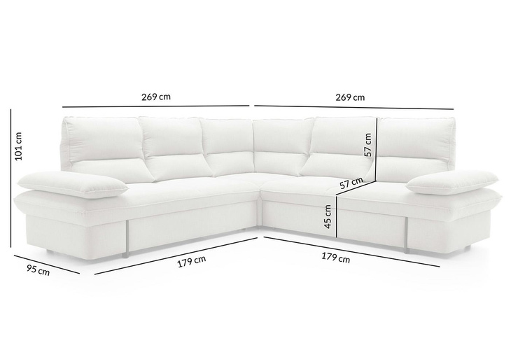 Narożnik SOFIA z funkcją spania. Komfortowa sofa narożna wyprodukowana w Polsce, która spełni wszystkie Twoje wymagania. Siedzisko oraz oparcie wykonano ze sprężyny falistej oraz pianki PUR, która zapewnia najwyższą trwałość oraz wygodę. Możliwość wyboru tkaniny umożliwia stworzenie sofy idealnej do Twojego wnętrza. Praktycznym rozwiązaniem jest funkcja spania, która będzie idealnym zamiennikiem dla dodatkowego łóżka podczas przyjazdu gości oraz kiedy będzie chęć na dłuższy seans przy telewizorze. Wbudowany pojemnik na pościel pomoże w codziennym utrzymaniu porządku. Sofia to elegancka propozycja, która uzupełni zarówno klasyczne, jak i nowoczesne wnętrza. Wymiary: wys. 101 cm / szer. 269 cm / gł. 269 cm Wysokość do krawędzi siedziska: 45 cm.
