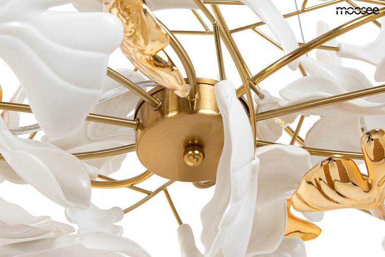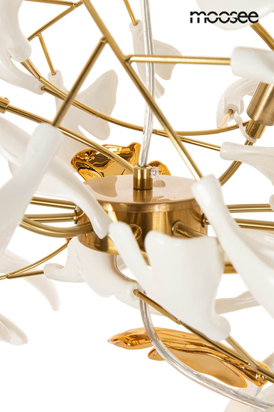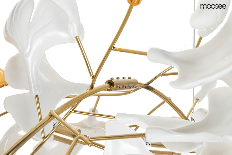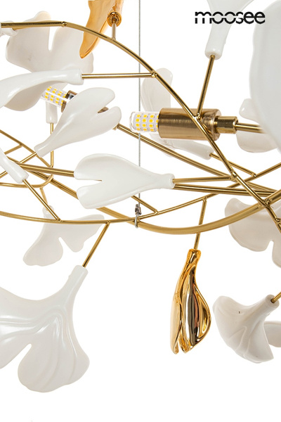 Całość umieszczono na eleganckim długim złotym stelażu, który przypomina gałązki.