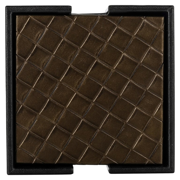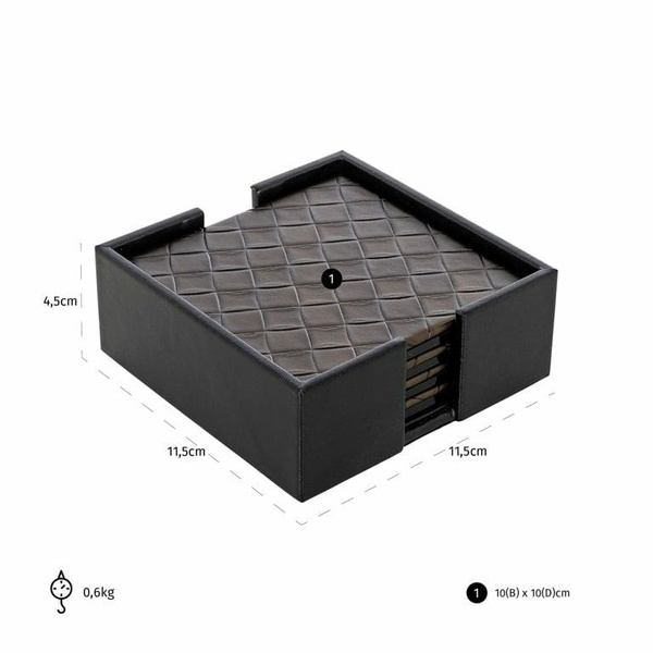 RICHMOND zestaw podkładek pod kubki YORA. Elegancki sposób na ochronę Twojego pięknego stołu. Całość wykonano z MDF,szkła oraz sztucznej skóry, zestaw zawiera 4 sztuki podkładek oraz pojemnik. Doskonale sprawdzi się w celu położenia kubków z napojem, a także udekorowania Twojej jadalni. Wymiary: wys. 4 cm / szer. 10 cm / gł. 10 cm Waga netto: 0,7 kg.