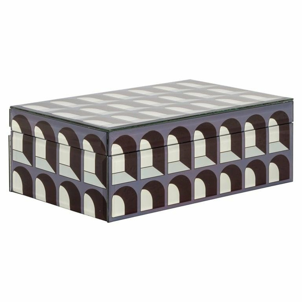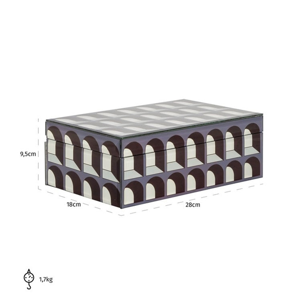 RICHMOND pojemnik na biżuterię VAYA L. Idealne rozwiązanie dla osób poszukujących eleganckiego i luksusowego sposobu przechowywania swojej cennej biżuterii i innych wartościowych rzeczy. Pięknie zdobione wykonanie z metalu i szkła wykończono w stonowanej kolorystyce. Delikatne wzory przypominające kolumny sprawiają wrażenie 3D i dodają subtelnej elegancji oraz oryginalności. Dostępna także większa wersja. Wymiary: wys. 9,5 cm / szer. 28 cm / gł. 18 cm Waga netto: 1,7 kg.