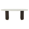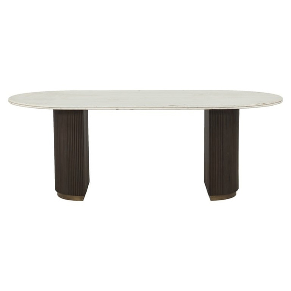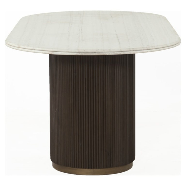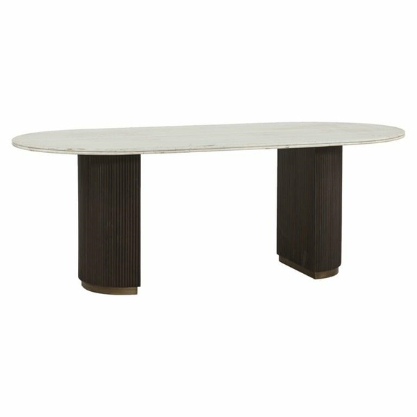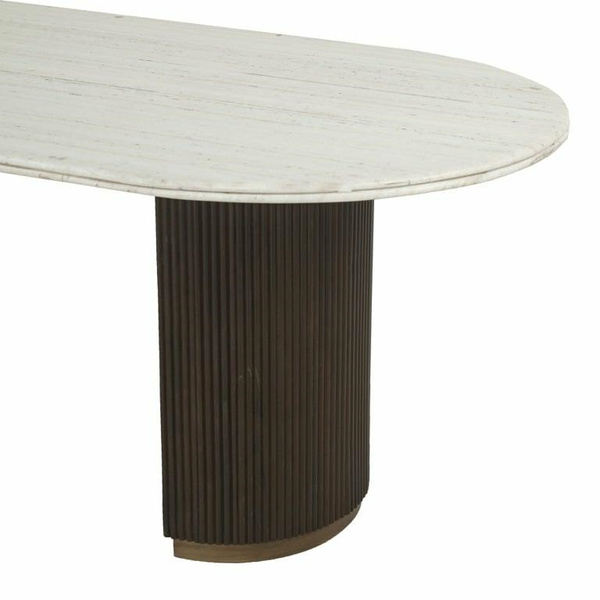 Piękny, owalny blat zdobi biały marmur, a podstawę drewniane lamele w połączeniu z mosiądzem.