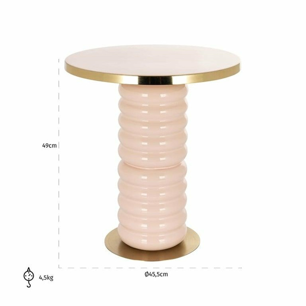 Wykonany z jasnoróżowego metalu o cylindrycznej podstawie przyciąga wzrok swoim zaokrąglonym, falistym kształtem.