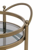 RICHMOND barek HENDRICKS mosiądz / szczotkowane złoto. Elegancki okrągły barek na kółkach Hendricks marki Richmond Interiors wykonany jest z aluminium, metalu oraz szkła. Ciemnoszklany blat idealnie współgra z matową mosiężną postawą. Dwie wbudowane półki dodają mu wielofunkcyjności. Możesz na nim przechowywać między innymi napoje oraz dekoracje, czasopisma. Z całą pewnością ozdobi Twój dom i wpisze się w najnowsze trendy. Dostępna również złota wersja. Wymiary: wys. 74,5 cm / szer. 55 cm / gł. 45 cm Waga brutto: 17,4 kg.