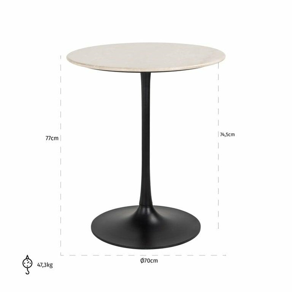 Stolik Tavolo charakteryzuje się okrągłym blatem wykonanym z jasnego marmuru, co dodaje mu luksusowego wyglądu.
