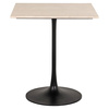 Podstawa stolika jest wykonana z czarnego metalu, w kształcie tulipanowym, co nadaje całości nowoczesnego charakteru.
