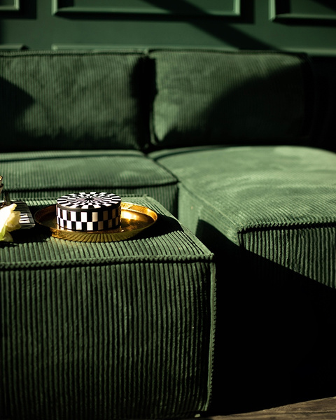 Prezentowana na zdjęciu tkanina to przyjemna w dotyku tkanina sztruksowa w zielonym wykończeniu o nazwie Poso 14.