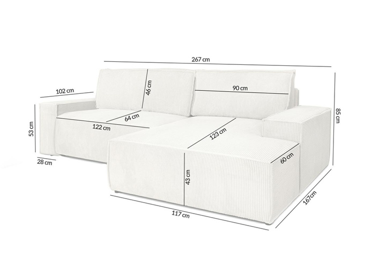 Wymiary: wys. 85 cm / szer. 267 cm / gł. 167 cm