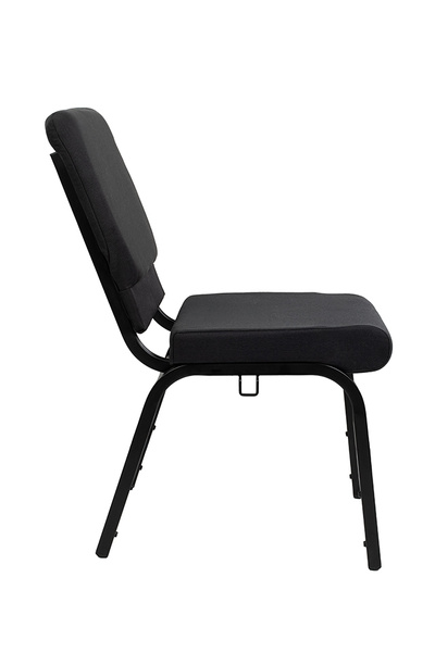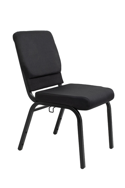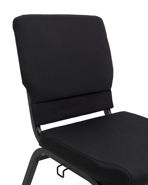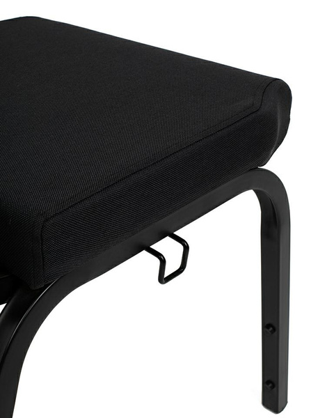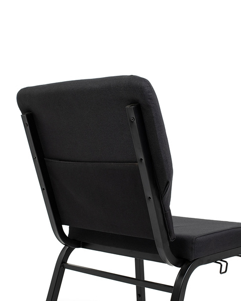 Krzesło wyposażono w miękką poduszkę siedziska oraz profilowane oparcie tapicerowane czarną tkaniną, co zapewnia komfort nawet podczas wielogodzinnych spotkań czy wykładów. Stalowa rama gwarantuje stabilność i trwałość, a boczne złącze umożliwia szybkie łączenie krzeseł w estetyczne rzędy.
