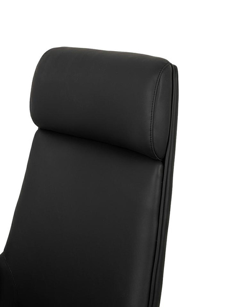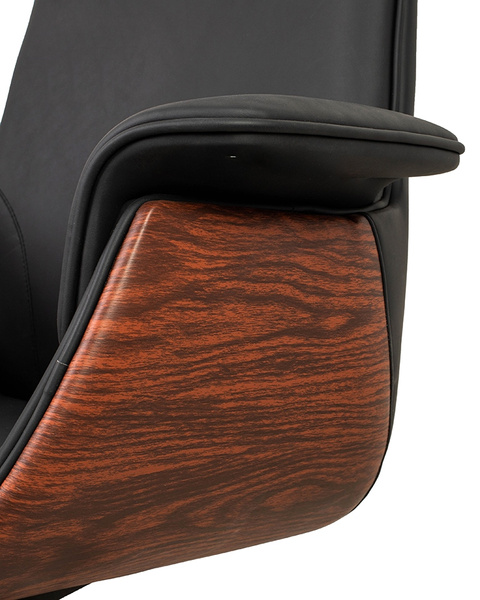 Tapicerowany miękką, wysokiej jakości skórą ekologiczną, zachwyca profilowanym oparciem z zagłówkiem oraz stylowym wykończeniem z ekoskóry imitującej drewno.