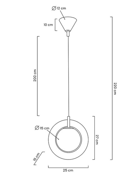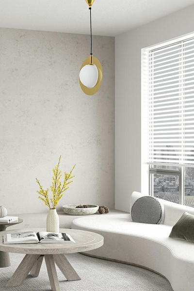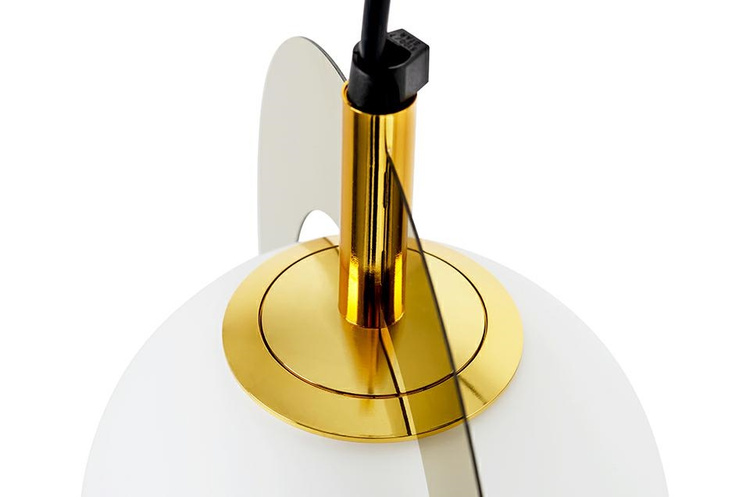 Okrągły klosz, wykonany został z mlecznego szkła. Klosz otoczony jest złotym, metalowym dyskiem.