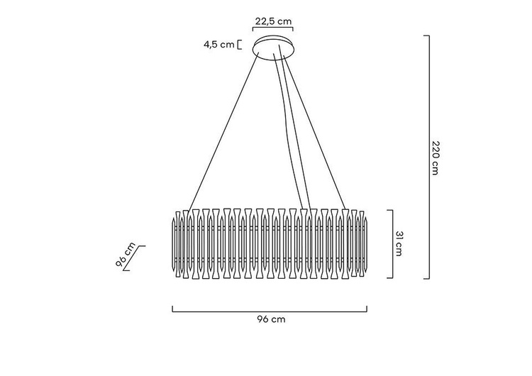 Całość zamocowana jest na podsufitce w kolorze lampy i stalowych linkach.