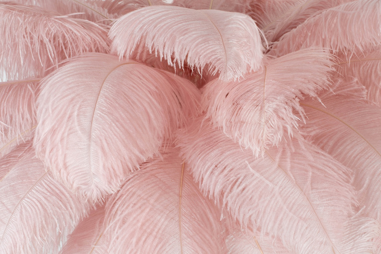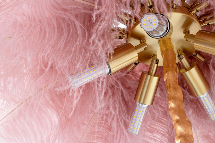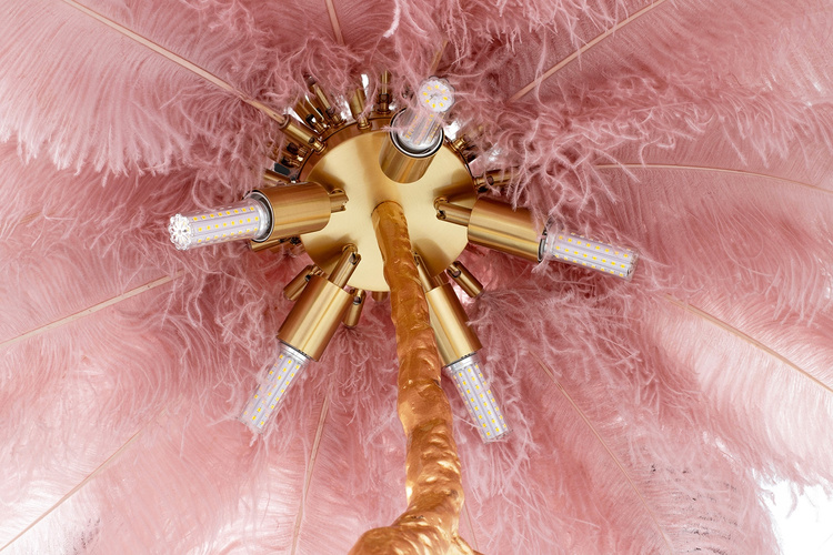 Klosz lampy tworzy 45 sztuk gęsto ułożonych, naturalnych strusich piór o długości 55-60 cm.