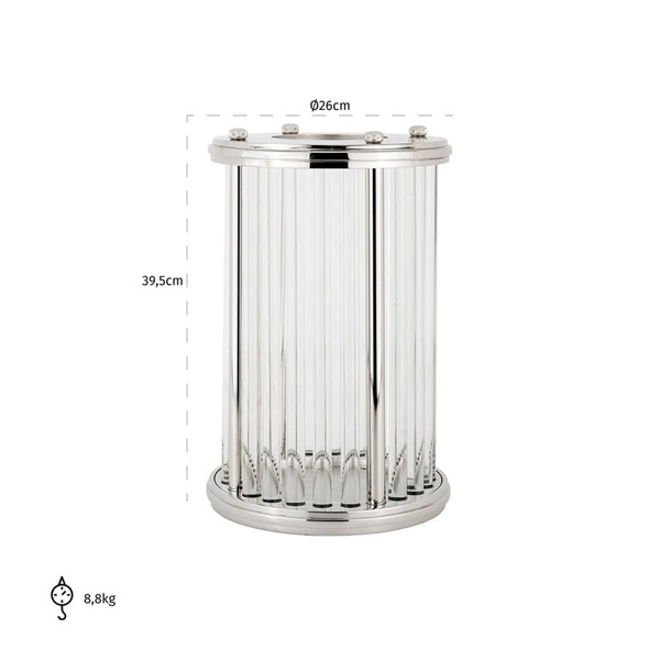 RICHMOND świecznik EADEN srebrny. Sposób na piękne ozdobienie oraz ożywienie Twojego wnętrza. Światło od palącej się świeczki delikatnie przenika przez przezroczyste szkło, tworząc nastrojowe oświetlenie. Srebrne aluminium dodaje całości szykownego akcentu. Dostępna także mniejsza wersja pod nazwą Eaden oraz w innych kolorach. Wymiary: wys. 39,5 cm / szer. 26 cm / gł. 26 cm Waga netto: 8,8 kg.
