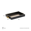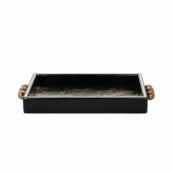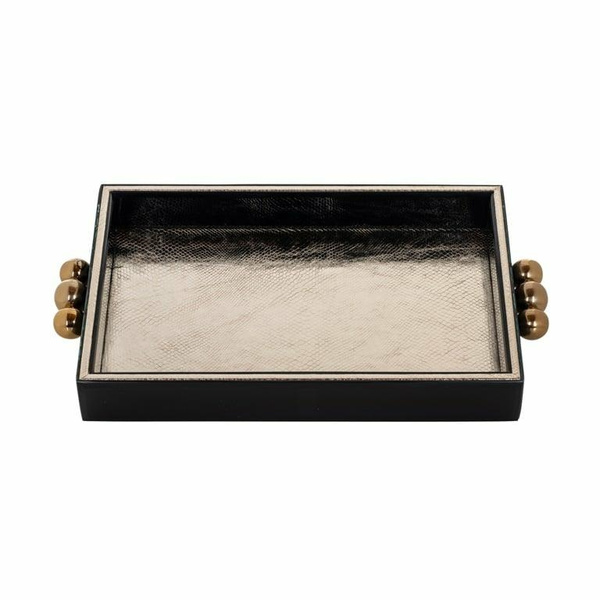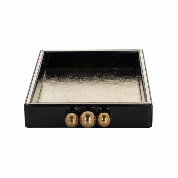 RICHMOND taca dekoracyjna LIV. Prostokątna taca, która przywołuje na myśl elegancję i nowoczesność. Rama w ciemnym wykończeniu została ozdobiona trzema złotymi kulami, pełniącymi funkcję akcentujących detali i uchwytów. Całość wykonano z płyty MDF, szkła oraz metalu. Liv to sposób na nowoczesne oraz stylowe ozdobienie Twojego wnętrza. Wymiary: wys. 5,5 cm / szer. 39 cm / gł. 26 cm Waga netto: 1,9 kg.