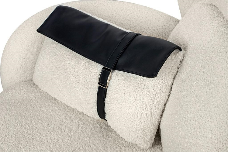 Ciekawym akcentem jest poduszka wzbogacona ozdobnym czarnym paskiem z ekoskóry.