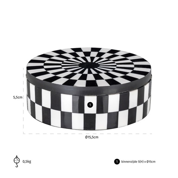 RICHMOND pojemnik dekoracyjny NORE charakteryzuje luksusowy i nowoczesny wygląd. Składa się z okrągłego pojemnika wykonanego z metalu oraz żywicy. Całość ozdobiono geometrycznym wzorami w kolorystyce biało-czarnej. Nore to wspaniały sposób na przechowanie Twoich ulubionych rzeczy oraz udekorowanie wnętrza. Wymiary: wys. 5,5 cm / szer. 11,5 cm / gł. 11,5 cm Waga netto: 0,5 kg.