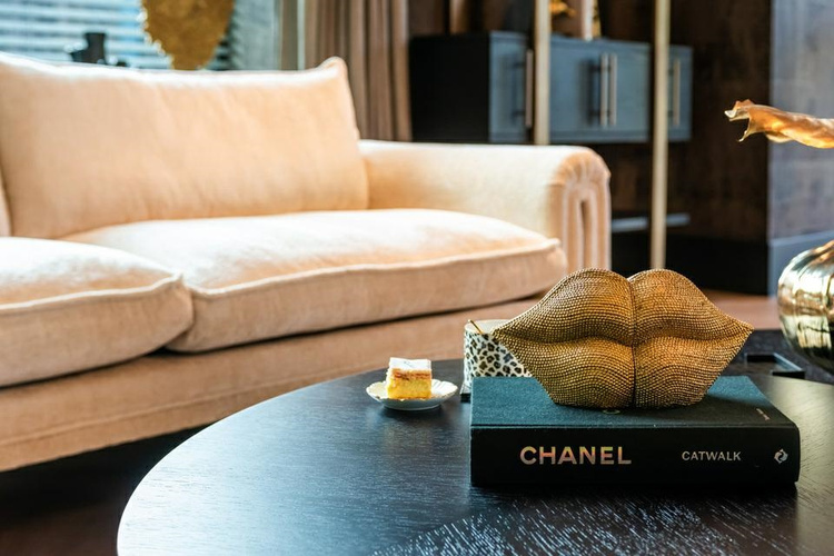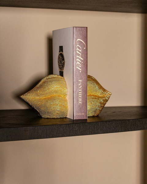 Główną ozdobą są tu biżuteryjnie wykonane usta z żywicy w eleganckiej złotej kolorystyce.
