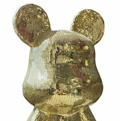 Imponująca figura misia, której powierzchnię zdobią ręcznie rzeźbione szklane mozaiki w eleganckim złotym odcieniu.
