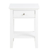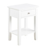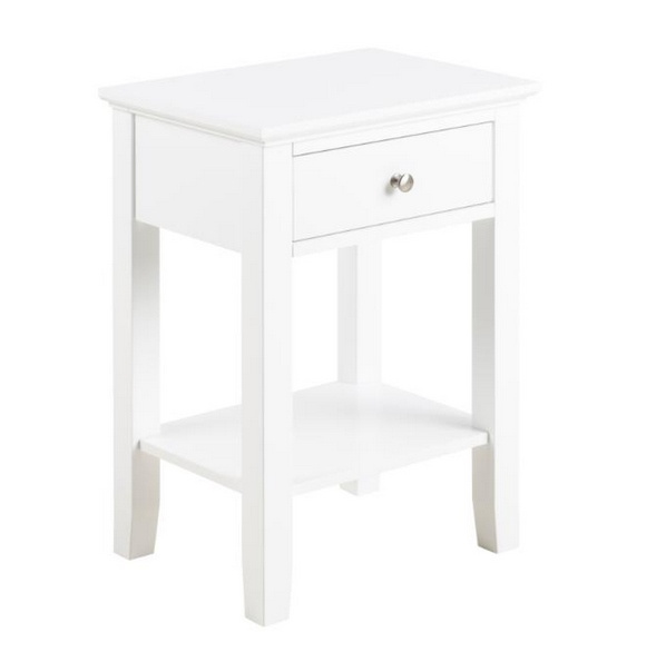 Praktyczną szafkę nocną z szufladą na drobiazgi wykonano z płyty MDF w kolorze białym.