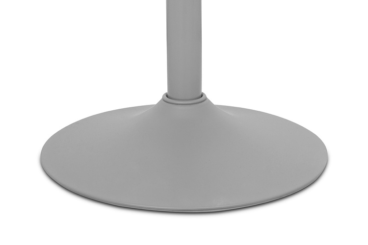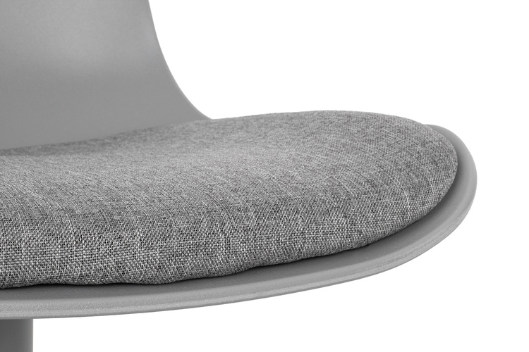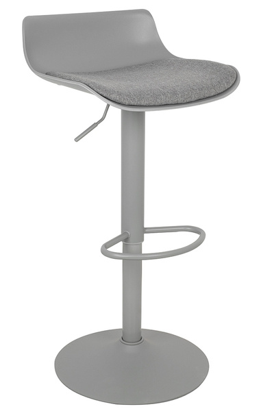Siedzisko z poduszką zostało wykonane z tworzywa sztucznego, a postawa z metalu w kolorze szarym.