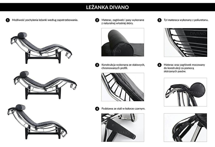 Skóra posiada unikalne wzory (każda leżanka ma inny wzór, zamieszczone zdjęcie przedstawia oferowany produkt).