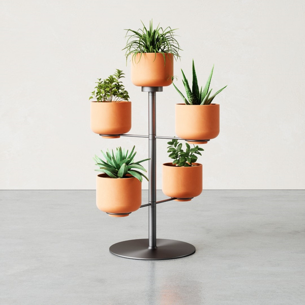 UMBRA doniczka stołowa TERRAPOTTA tytanowa. Doniczka stołowa, z uchwytem na 5 doniczek wykonanych z terakoty. Ten stojak doda świeżości oraz innowacji twojemu mieszkaniu. Składa się ona z dwóch metalowych prętów, które obracają się o 360 stopni. Można w nich posadzić sukulenty, winoroślą czy inne małe rośliny. Jest oparta na solidnej metalowej podstawie, dzięki czemu jest trwała i odporna na rdzę.