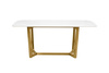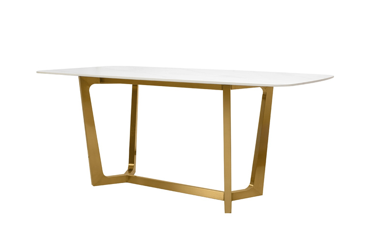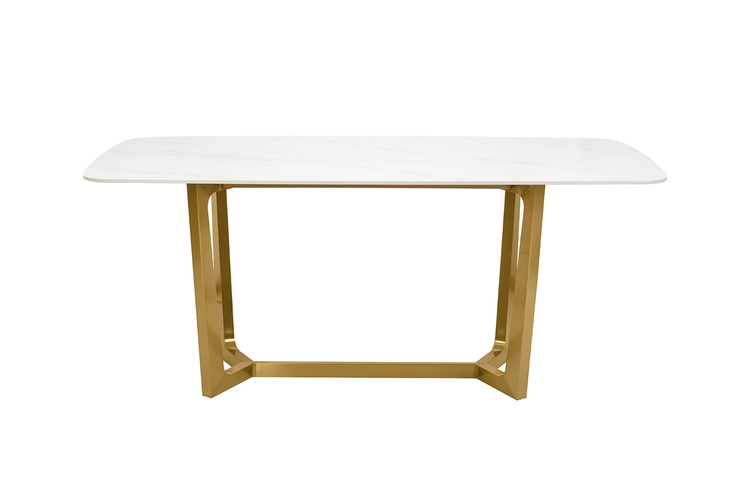 Stół ODEON 180 biały. Kwintesencja nowoczesnego designu połączonego z luksusem. Biały ceramiczny blat imitujący marmur emanuje subtelną elegancją i harmonijnie współgra z imponującą podstawą wykonaną ze stali nierdzewnej w złotym odcieniu. Odeon to stół jadalniany, który doda wyjątkowego charakteru w Twojej jadalni i umili każdy posiłek swoją dostojnością. Dostępna także czarna wersja blatu. Wymiary: wys. 76 cm / szer. 180 cm / gł. 90 cm Blat: wys. 1 cm / szer. 180 cm / gł. 90 cm. Podstawa: wys. 75 cm / szer. 105 cm / gł. 45 cm.