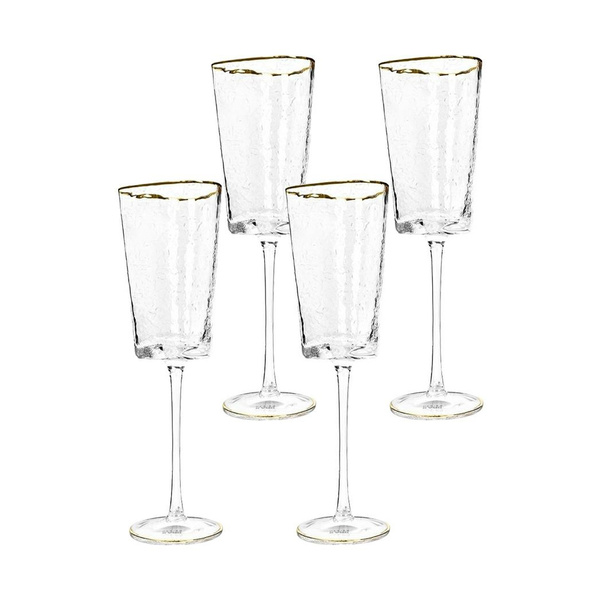 KARE komplet kieliszków do wina HOMMAGE 300 ml. Nowoczesna propozycja od marki Kare Design z pewnością odnajdzie praktyczne i ozdobne zastosowanie podczas każdej uroczystości. Przezroczyste naczynie zostało ręcznie wykonane w całości ze szkła. Złote akcenty i wyjątkowe wykończenie dodają całości niezwykłej elegancji. Nie należy myć w zmywarce. Zestaw zawiera 4 sztuki produktu. *W kieliszku mogą wystąpić pęcherzyki powietrza, które są naturalnym efektem powstałym podczas ręcznej obróbki szkła. Wymiary 1 szt: wys. 22 cm / szer. 9 cm / gł. 9 cm Waga: 0,3 kg Sposób wysyłki: Paczka.